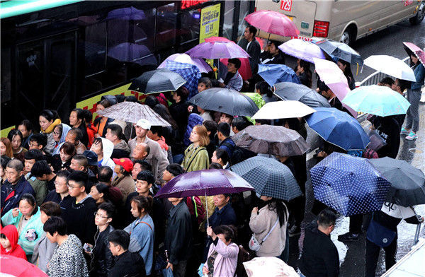 2019年10月6日,郑州,民众冒雨在公交车站候车。河南多地秋雨连绵,气温持续下降。