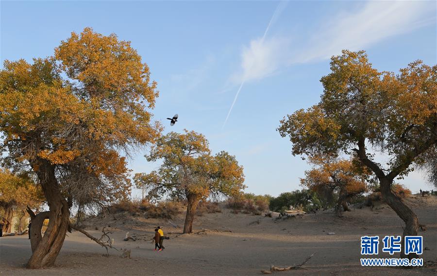 10月16日,游客在内蒙古自治区额济纳旗的胡杨林游览。新华社记者丁洪法摄