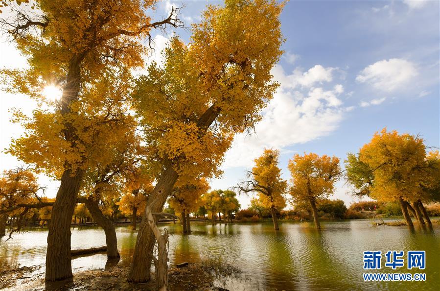 10月16日,这是内蒙古阿拉善盟额济纳旗境内的胡杨林。金秋时节,位于内蒙古阿拉善盟额济纳旗境内的胡杨林披上了金黄色的外衣,在阳光的照射下呈现绚丽夺目的色彩,成为沙漠深处的一抹亮色。新华社记者彭源摄
