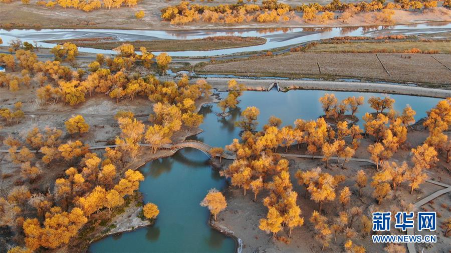 这是在内蒙古自治区额济纳旗拍摄的胡杨林(10月10日无人机拍摄)。金秋时节,内蒙古自治区额济纳旗胡杨林如同披上金装,成为大漠中的一抹亮色,吸引众多中外游客前来观赏游玩。新华社记者邹予摄