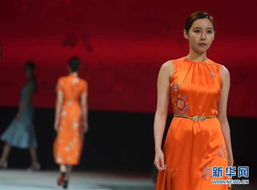 10月16日,模特在展示婚庆礼服。 当日,“愿·缘·圆”上久楷婚庆主题秀在江苏省苏州市吴江区盛泽镇举行。新华社记者 季春鹏 摄