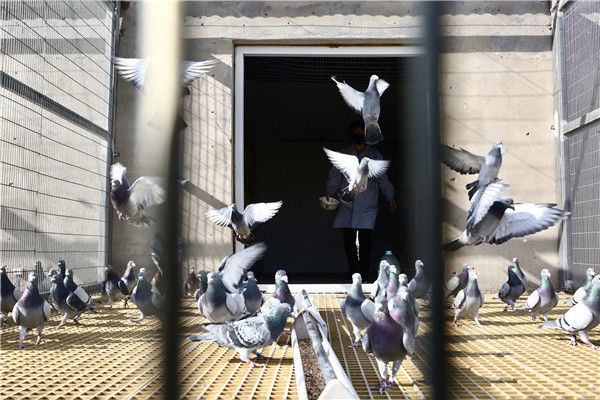 2019年10月15日,北京。鸽子一天喂两次,除了谷物还得添加专门的石子以帮助它们消化。