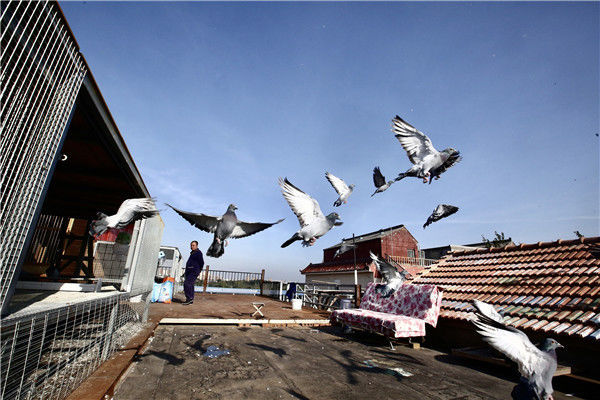 2019年10月15日,北京。鸽子的飞翔训练每天两次。放飞鸽子后董先生把旗子竖起来,等旗子放下来后鸽子看到信号就会回笼。