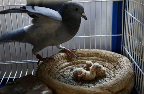 2019年10月15日,北京。种鸽下蛋孵七、八化天后,就会让“保姆鸽”来孵,小鸽子出生十天左右就可以装上脚环。