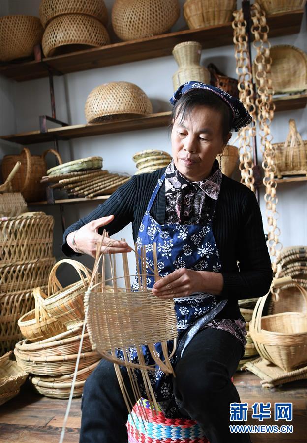 10月16日,团结村的“巧媳妇”袁悦花在编织竹制家庭用具。 新华社记者 杨宗友 摄