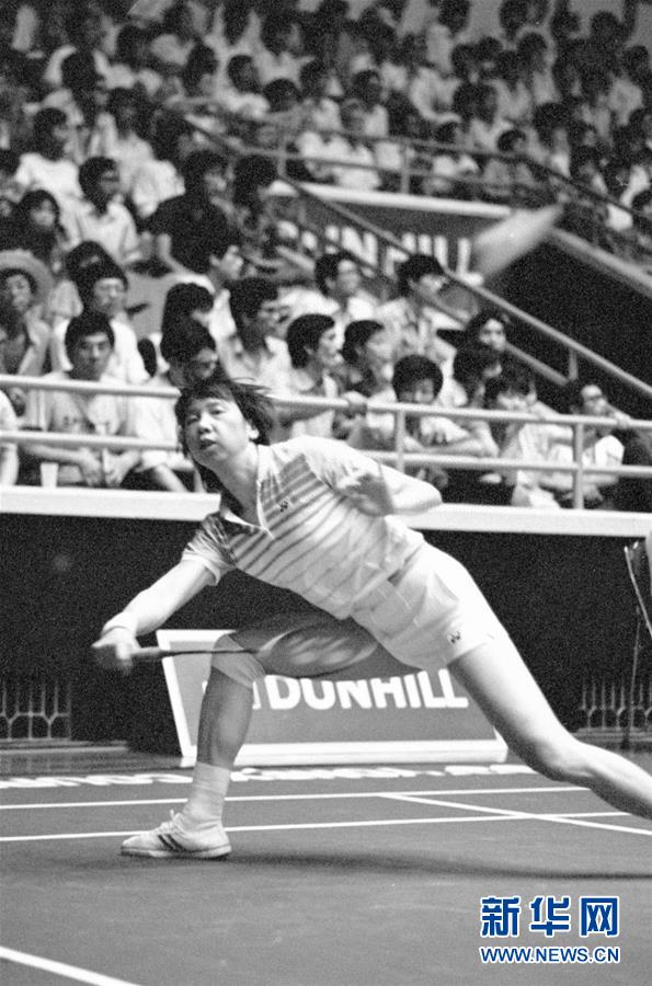 图为韩爱萍在杭州举行的第二届世界羽毛球锦标赛女子单打比赛中跨步救球(资料照片),她最终夺得女单冠军。新华社记者胡越摄
