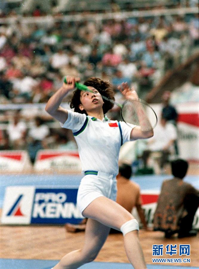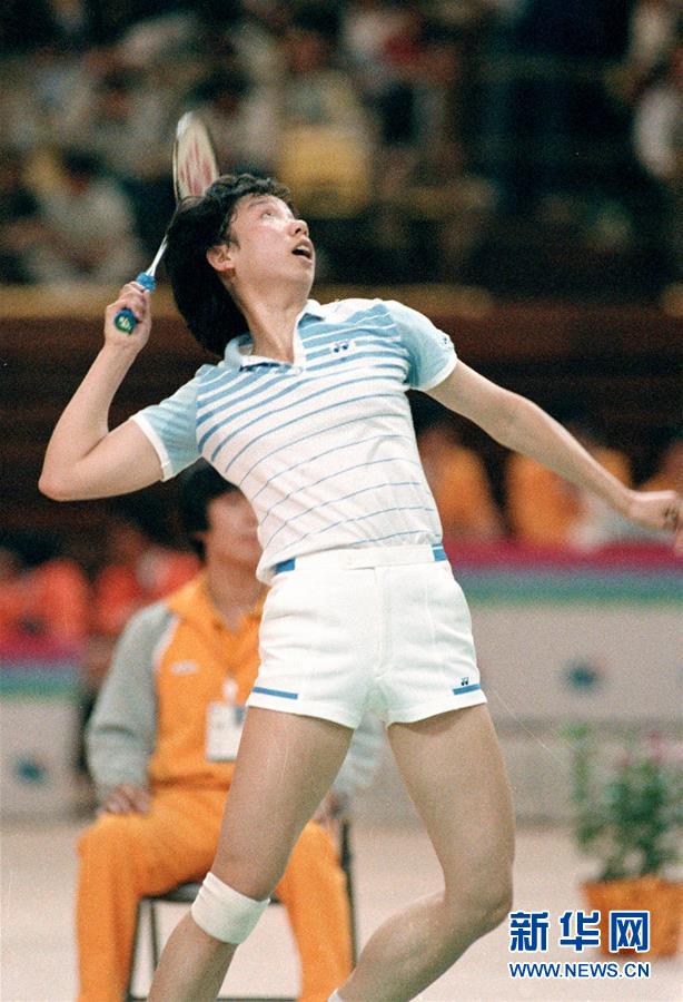 图为韩爱萍在韩国汉城(首尔)举行的第十届亚洲运动会羽毛球女子单打比赛中击球(资料照片),她最终夺得女单冠军。新华社记者胡越摄
