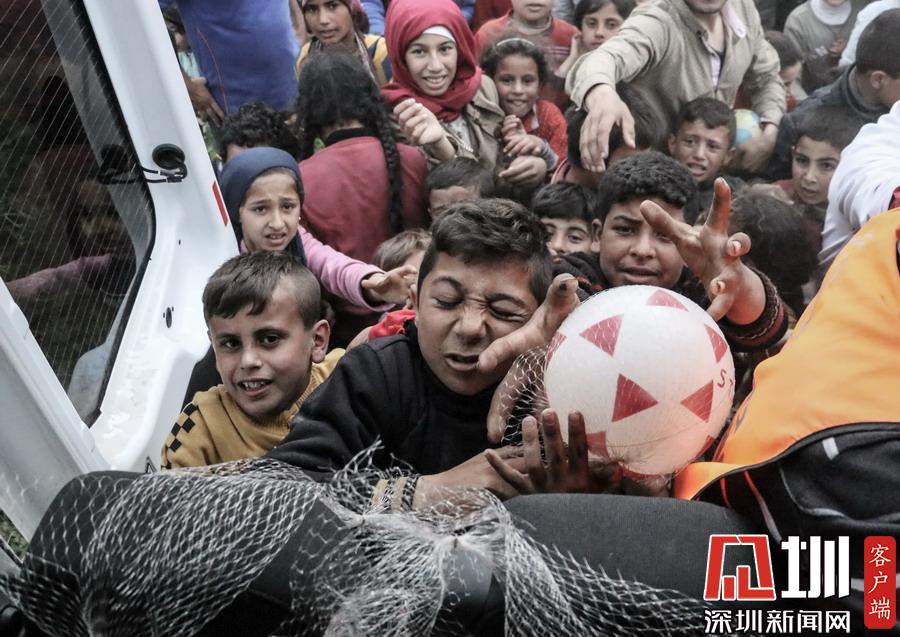 当地时间2018年3月18日,叙利亚阿勒颇,叙利亚难民领取灾害和应急管理机构提供的粮食救援。1月20日,土耳其发动针对叙利亚阿夫林地区库尔德人的橄榄枝行动,阿勒颇诸多村镇被清理,当地居民急需日常生活救援。