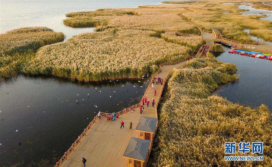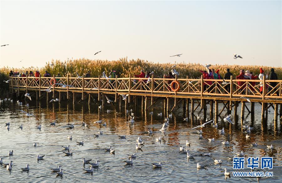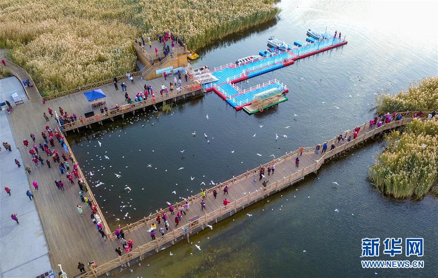 10月17日,游客在居延海岸边的木栈道上给水鸟喂食。 新华社记者 彭源 摄