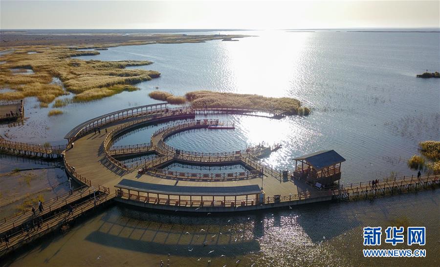 10月17日,游客在居延海岸边的木栈道上观赏水鸟。新华社记者 彭源 摄