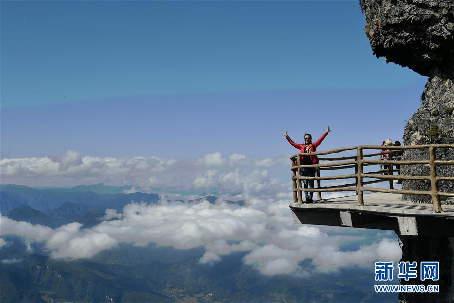 10月17日,游客在汉中市南郑区龙头山风景区拍照。 陕西省汉中市南郑区龙头山风景区位于川陕交界处米仓山主梁。龙头山景区常年云雾缭绕,宛如仙境,还有奇石、云海、彩林、雾凇等景观令游客流连忘返。 新华社记者 张博文 摄