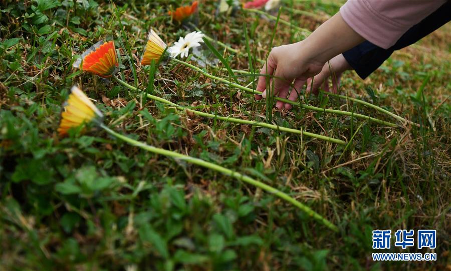 10月19日,参与秋祭活动的民众在活动现场献花。 新华社记者 陈斌 摄