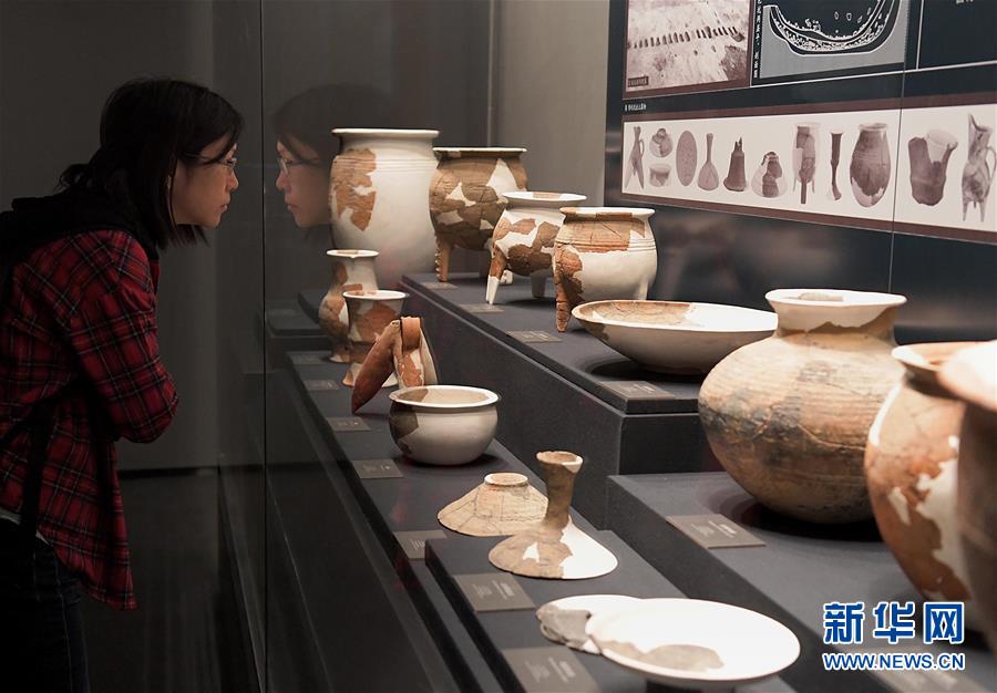 10月19日,参观者在二里头夏都遗址博物馆内观看展出的陶器。 当日,历经两年多建设,备受关注的二里头夏都遗址博物馆正式开馆。青铜器、陶器、玉器、绿松石器、骨角牙器等2000余件藏品,集中展示了二里头遗址作为“华夏第一王都”的丰富内涵。 二里头遗址位于河南省洛阳市偃师二里头村,距今约3800年—3500年,1959年由史学家徐旭生发现,是经考古学与历史文献学考证的中国最早王朝——夏朝中晚期的都城遗存。 新华社记者 李安 摄