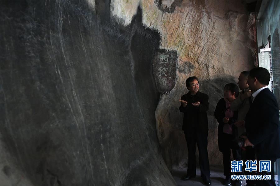 10月16日,成县文物保护专家张建文(左一)向客人讲解汉代摩崖石刻《西狭颂》。新华社记者陈斌摄
