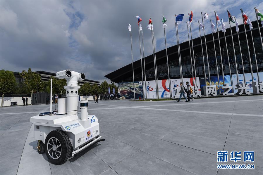 这是互联网之光博览会场馆外巡逻的5G警用机器人(10月18日摄)。新华社记者徐昱摄