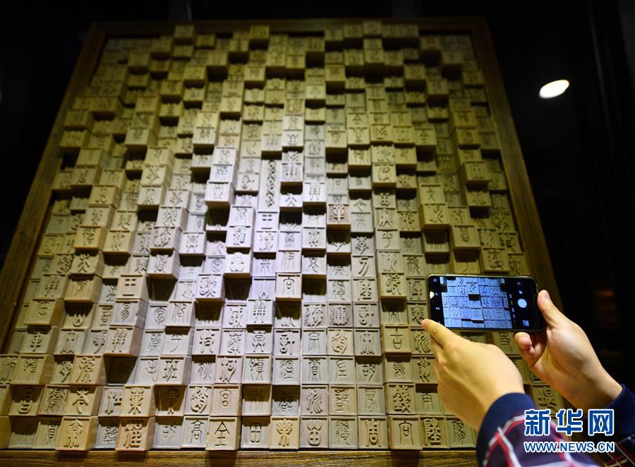 游客在景德镇陶溪川拍摄用3D陶瓷打印技术创作的“百家姓字模”作品(10月16日摄)。新华社记者胡晨欢摄