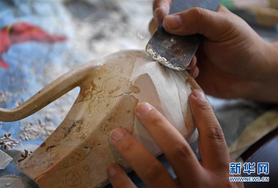 10月18日,在江西景德镇,工作人员修复一件瓷器。新华社记者万象摄