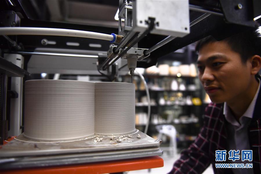 工作人员在景德镇陶溪川监测3D打印机制作陶瓷作品(10月16日摄)。新华社记者胡晨欢摄