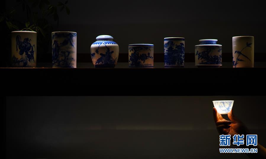 访客欣赏一只景德镇陶瓷工匠制作的薄胎茶杯(10月19日摄)。新华社记者胡晨欢摄