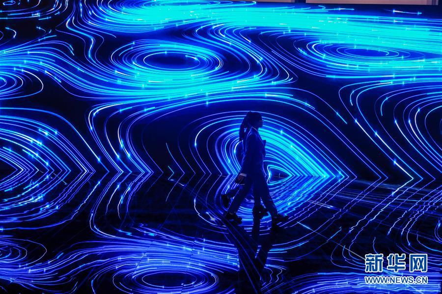 10月19日,两名工作人员走过乌镇互联网国际会展中心的大屏幕。新华社记者徐昱摄