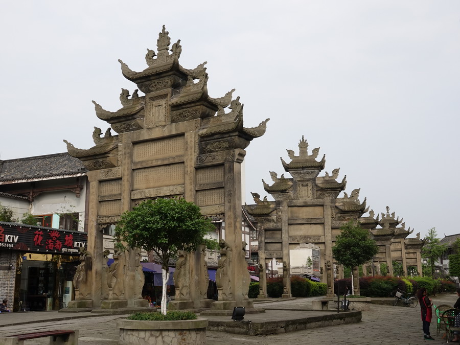 隆昌石牌坊大多为四柱三门三重檐五滴水石质牌楼式建筑,平均面宽9米,通高11米,坊间距离最近处仅10余米。李仁奇摄