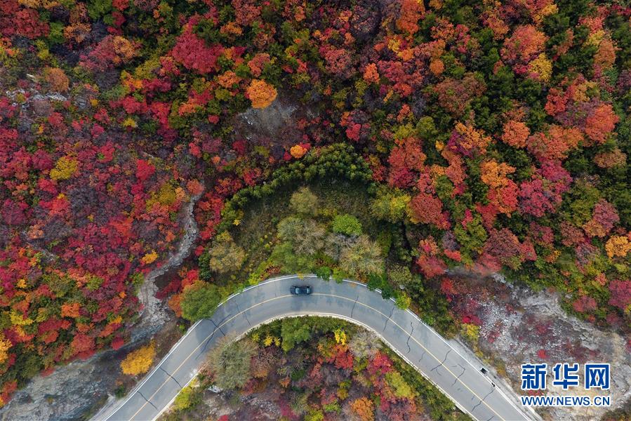 车辆行驶在山西省太原市玉泉山盘山公路上(10月22日无人机拍摄)。