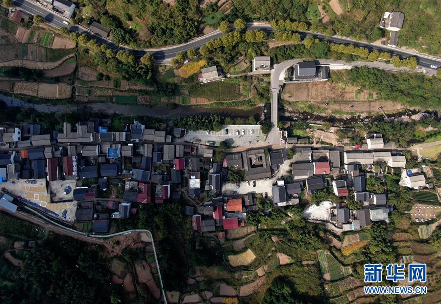 10月24日无人机拍摄的班竹村。浙江省新昌县境内的班竹村位于天姥山脚下,被称为“天姥门户”,曾是浙东“唐诗之路”上的驿站。近年来,班竹村依托深厚的文化底蕴大力发展乡村旅游,全村“人人参股、户户分红”,将整个村庄打造为旅游综合体,今年以来班竹村旅游收入已超过800万元。新华社记者韩传号摄