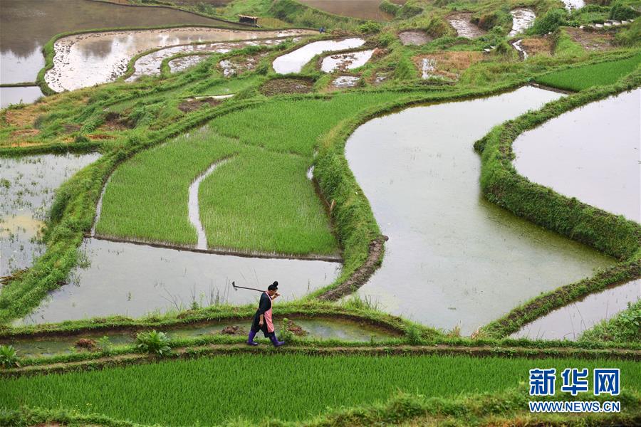 5月18日,农民从贵州省丹寨县龙泉镇高要梯田里走过。初夏时节,位于贵州省丹寨县龙泉镇的高要梯田景色优美。新华社记者杨文斌摄