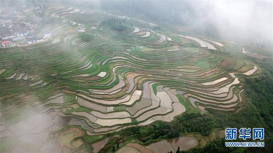5月18日,农民在贵州省丹寨县龙泉镇高要梯田里劳作。初夏时节,位于贵州省丹寨县龙泉镇的高要梯田景色优美。新华社记者杨文斌摄