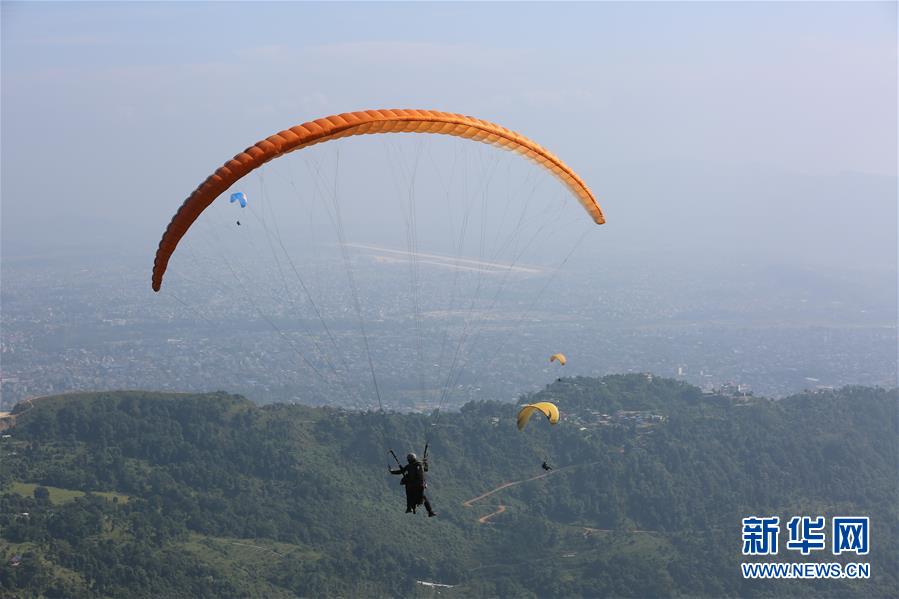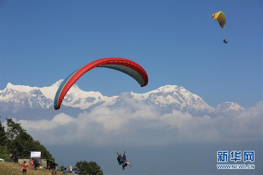 10月27日,在尼泊尔博克拉,游客乘滑翔伞飞行。 新华社记者 周盛平 摄