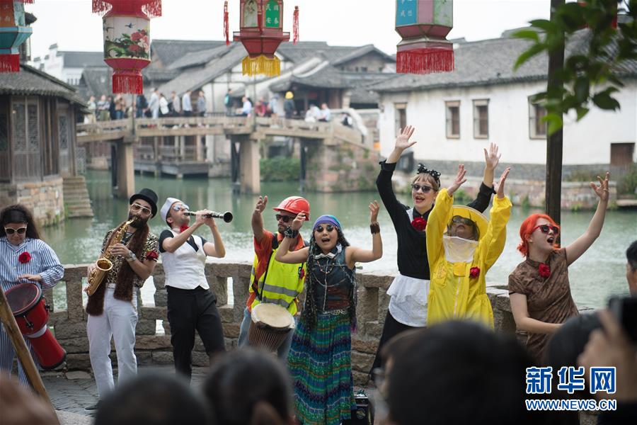10月26日,一个剧团在乌镇街头表演。 新华社记者翁忻旸摄