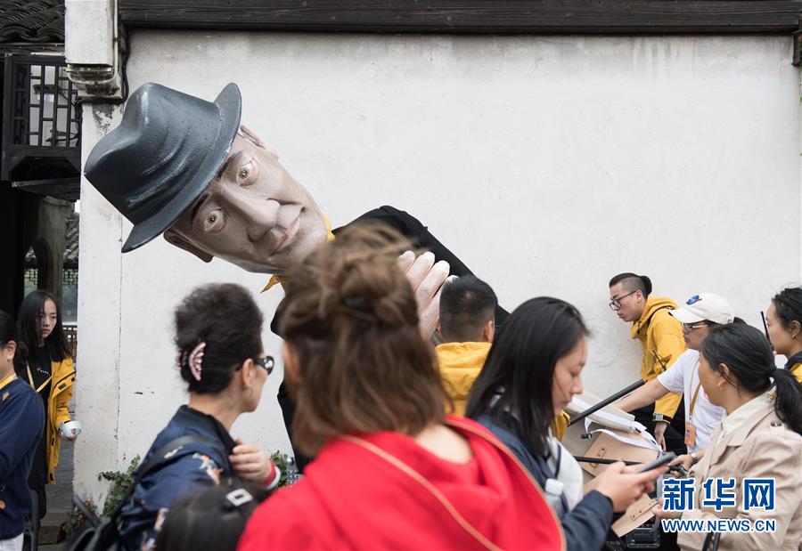 10月26日,游客经过一个正在竖起的戏剧人偶。 新华社记者翁忻旸摄