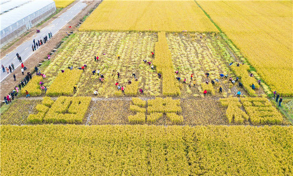 2019年10月26日,江苏省宿迁市泗洪县在稻米小镇石集乡举行具有地方特色的割稻比赛,近60名选手在金色稻田挥舞银镰、紧张角逐。张连华/视觉中国