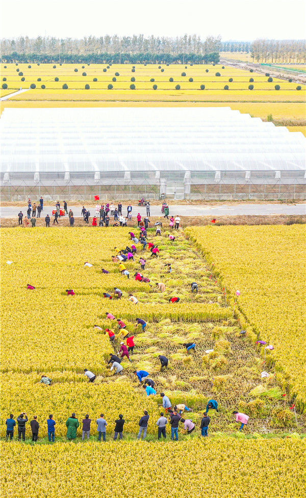 2019年10月26日,江苏省宿迁市泗洪县在稻米小镇石集乡举行具有地方特色的割稻比赛,近60名选手在金色稻田挥舞银镰、紧张角逐。
