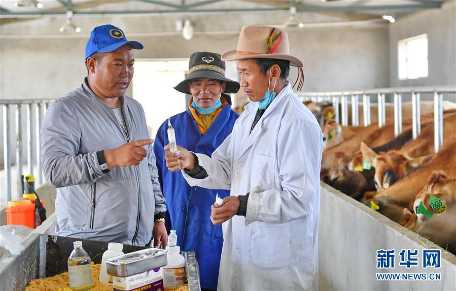 在阿里地区噶尔县生态农业产业园奶牛场,场长贡桑其美(左)和兽医及饲养员商量牛群防疫事宜(2018年8月1日摄)。新华社记者张汝锋摄
