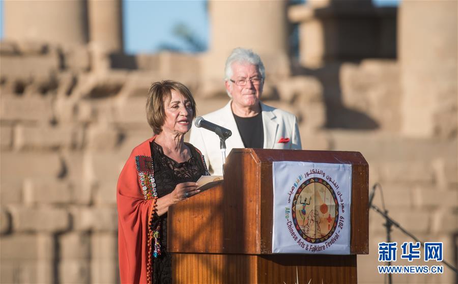 10月27日,在位于埃及阿斯旺的菲莱神庙,中非艺术节创始人苏海尔·阿卜杜勒-卡迪尔在开幕式上发言。 新华社记者 邬惠我 摄