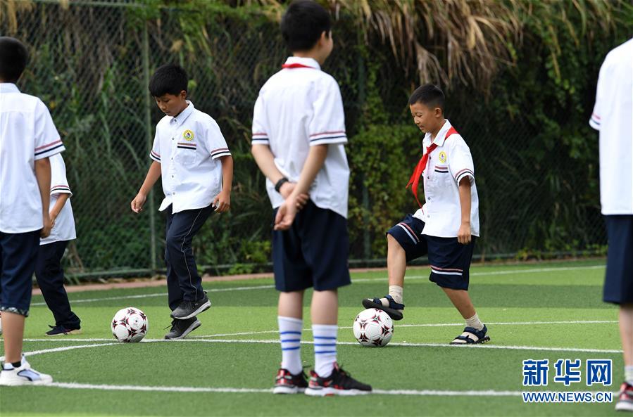 9月3日,金寨县希望小学学生在足球课上训练。新华社记者张端摄