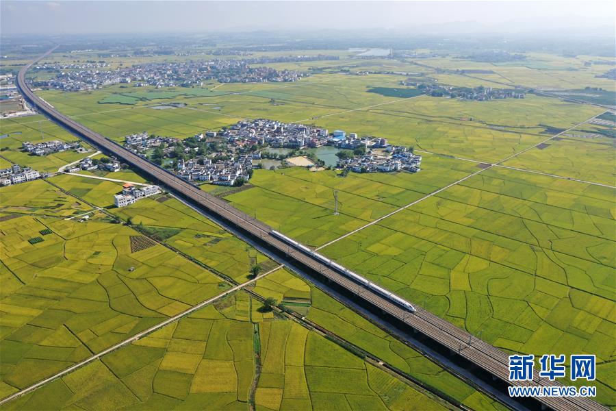 眼下,广西宾阳县古辣镇大面积稻田进入收获期,一列列南来北往的动车从稻田间飞驰而过,构成一幅幅美丽的丰收图画。