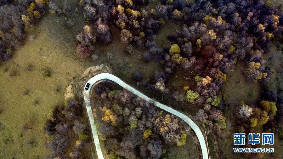 10月28日,一辆轿车行驶在陕西省陇县关山草原景区(无人机拍摄)。 新华社记者陶明摄