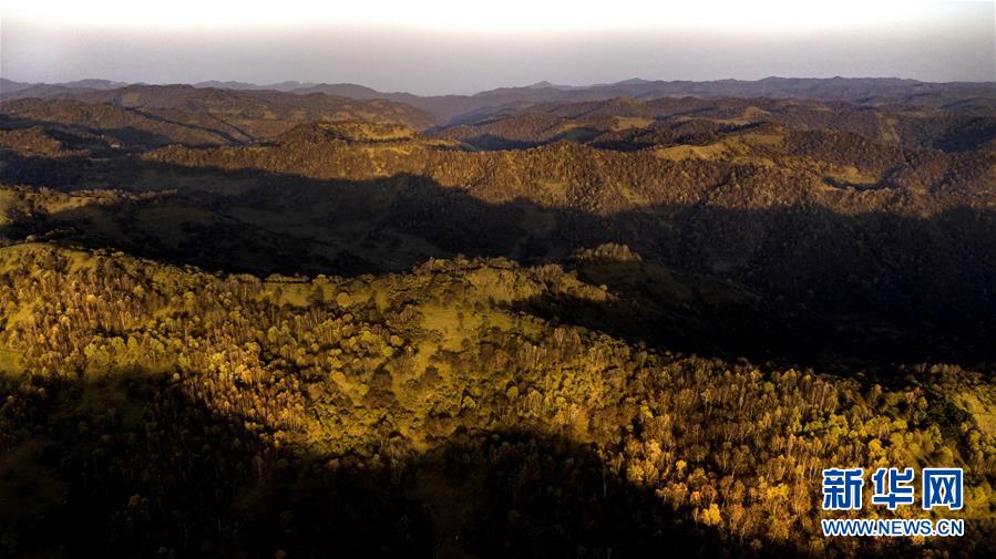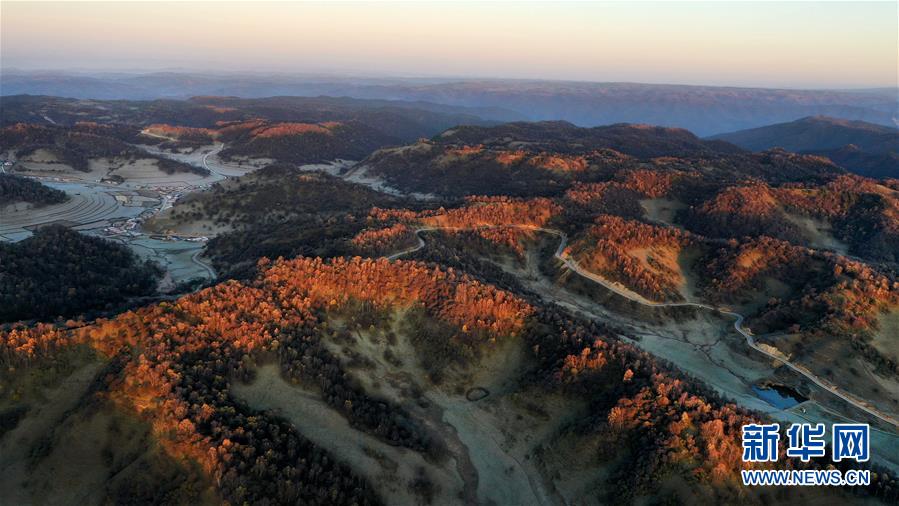 10月29日,初升的太阳照射下,山峦变成一片金黄(无人机拍摄)。 新华社记者陶明摄