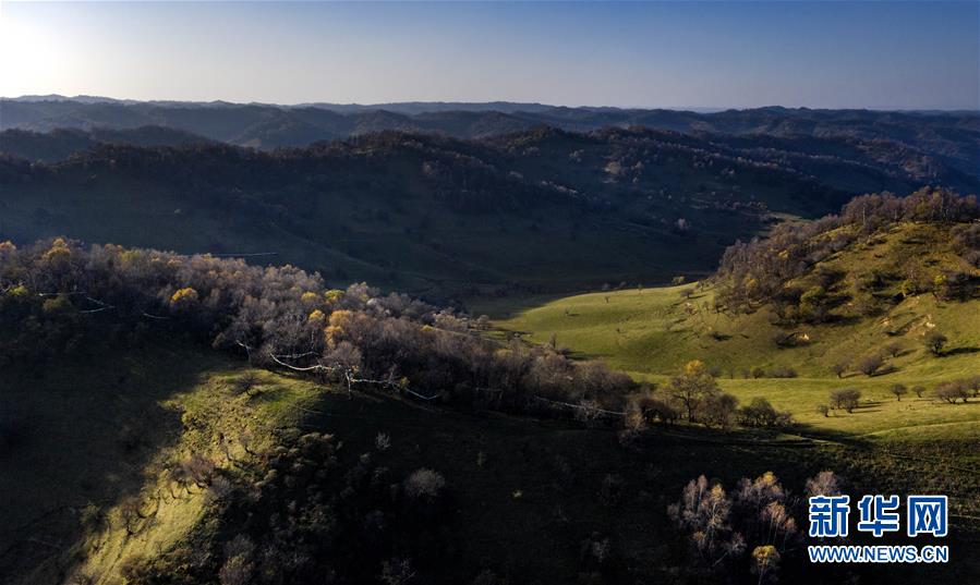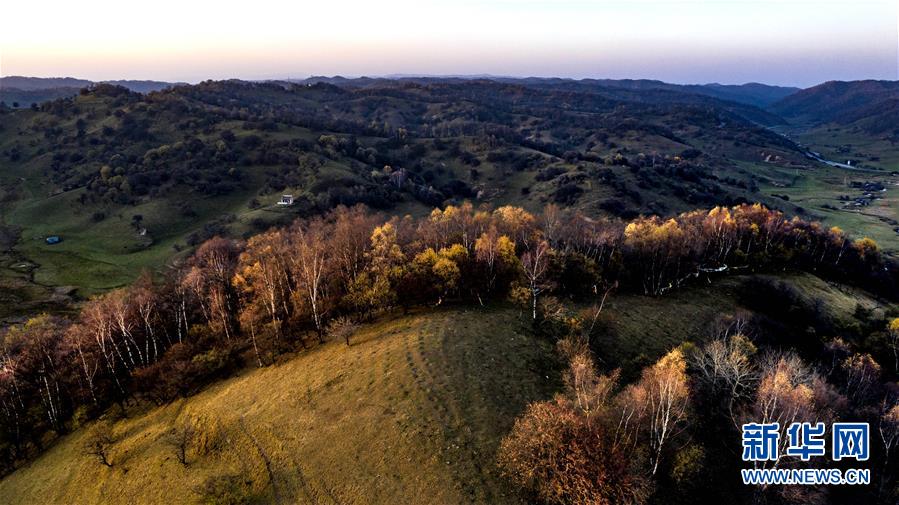 10月28日,夕阳照耀在起伏的草原上,宛如一幅天然图画(无人机拍摄)。 新华社记者陶明摄