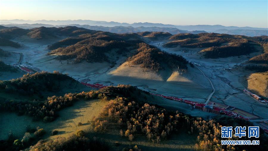 10月29日,初升的太阳照射在关山草原上,将山峦变成一片金黄(无人机拍摄)。 新华社记者陶明摄