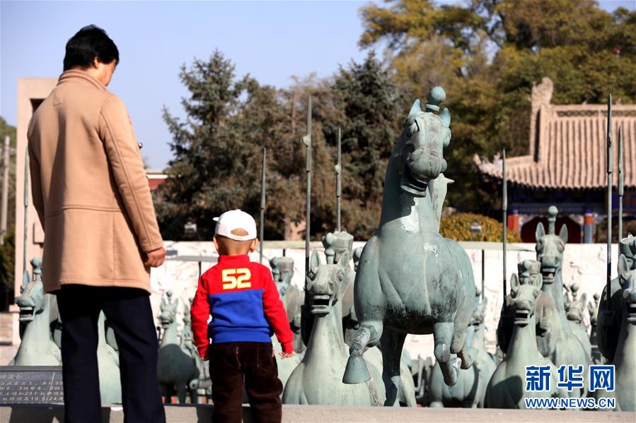 10月30日,游客在观看雷台汉墓景区“铜奔马”仪仗队。 新华社记者 郭刚 摄