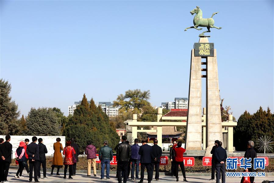 10月30日,游客在雷台汉墓景区“马踏飞燕”雕塑前游览。 新华社记者 郭刚 摄