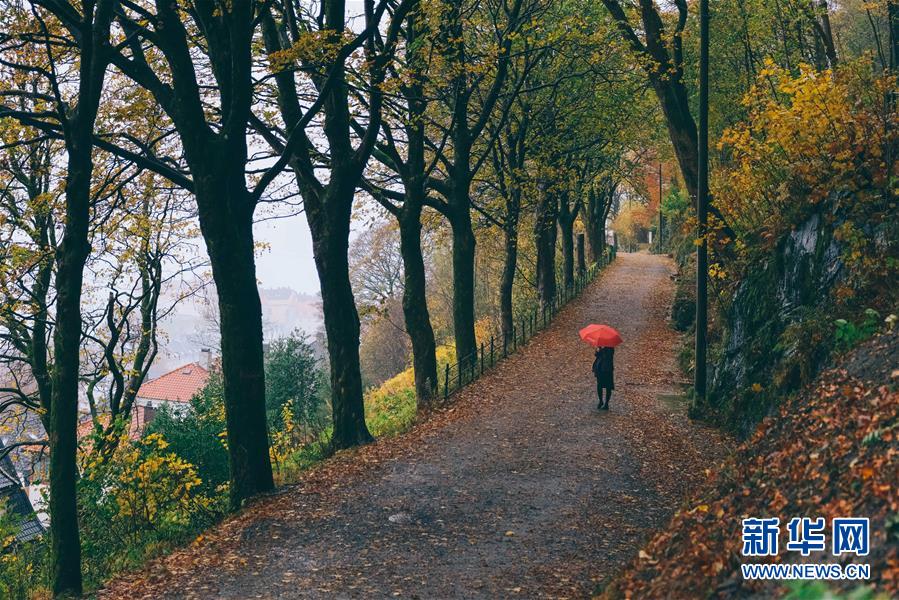 10月23日,一名行人走在挪威卑尔根街头。 新华社记者 张铖 摄
