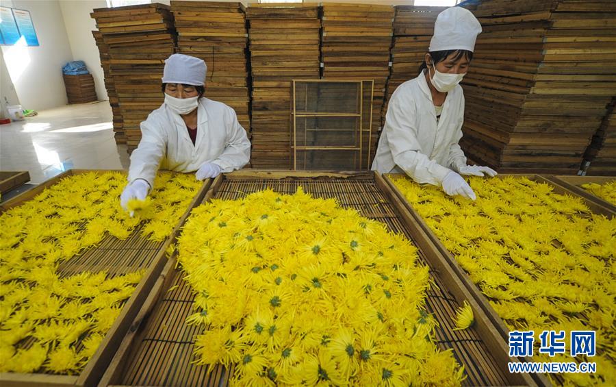10月31日,河北省永清县刘街乡胜利村农民在整理准备烘干的金丝皇菊。