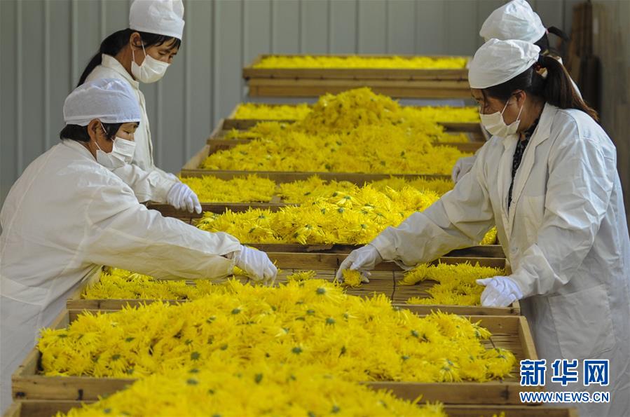 10月31日,河北省永清县刘街乡胜利村农民在整理准备烘干的金丝皇菊。新华社记者 李晓果 摄
