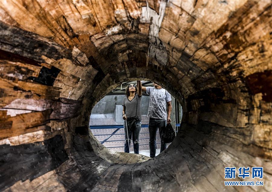 10月29日,在巴西圣保罗市艺术中心,一名丈夫帮助盲人妻子抚摸一件名为“树干”的艺术品。新华社记者 兰红光 摄