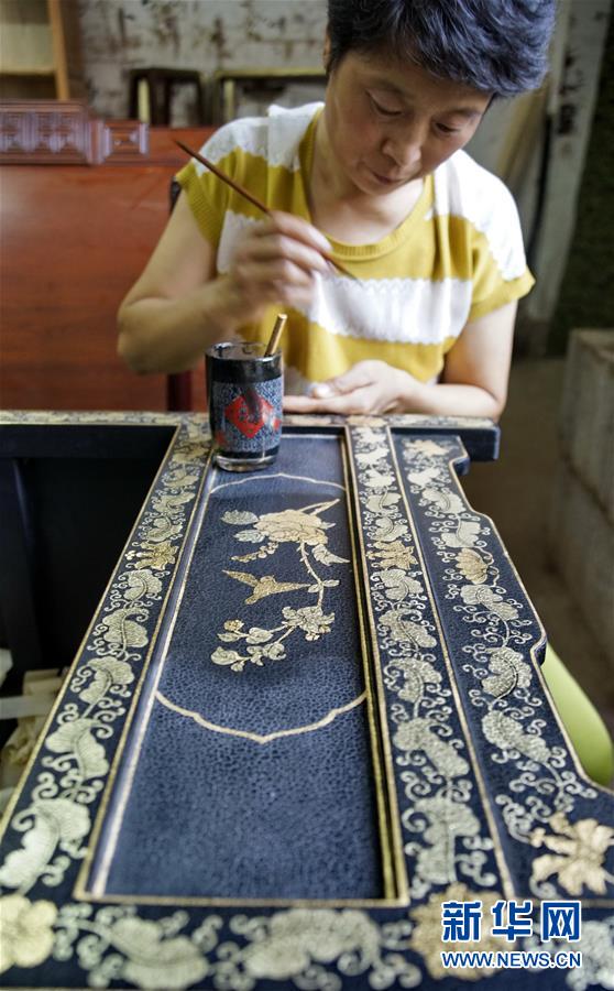 北京金漆镶嵌有限责任公司的技师运用贴金描漆的技艺制作屏风(10月31日摄)。新华社记者李欣摄