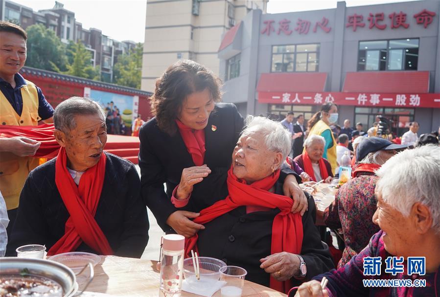11月2日,南京仙林街道党工委书记孙金娣(前左二)在千家宴上给老人们戴上围巾,送上祝福。 新华社记者 季春鹏 摄